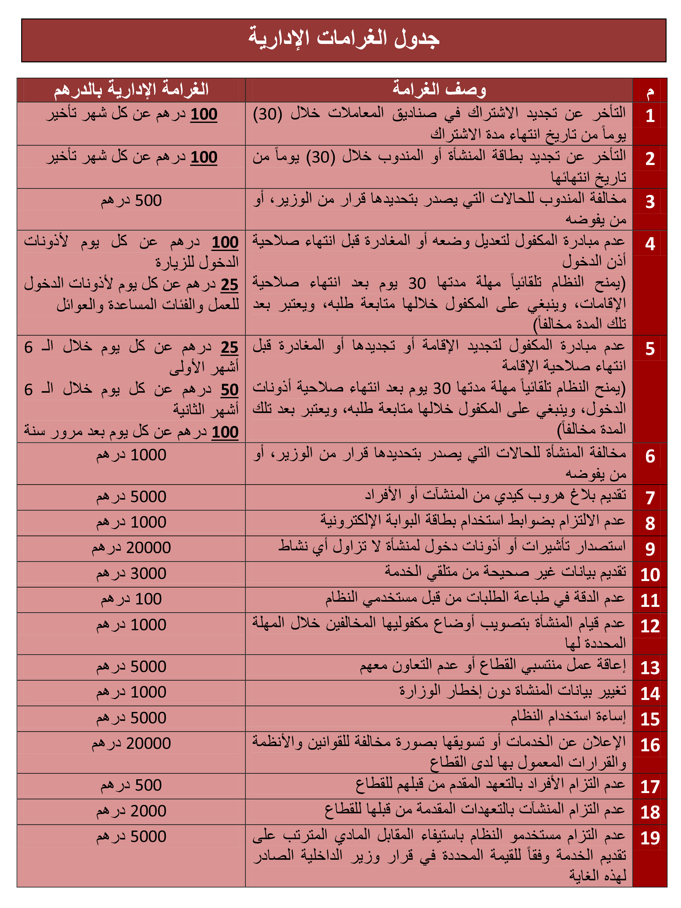 | 2 | التأخر عن تجديد بطاقة المنشأة أو المندوب خلال (30) يوماً من تاريخ انتهائها | 100 درهم عن كل شهر تأخير |